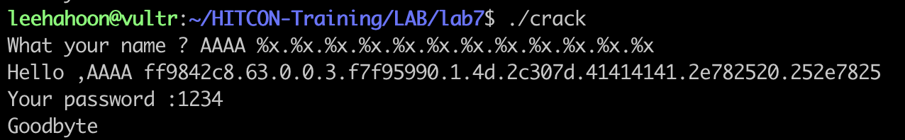 실행해보면, 우리가 입력한 값은 10번째에서 확인할 수 있다. 그렇다면 페이로드의 첫 4bytes는 password의 주소를 보내고 %s를 이용하면 해당 값을 읽을 수 있다. password 변수의 주소는 0x804a048이고 작성한 공격코드는 다음과 같다.