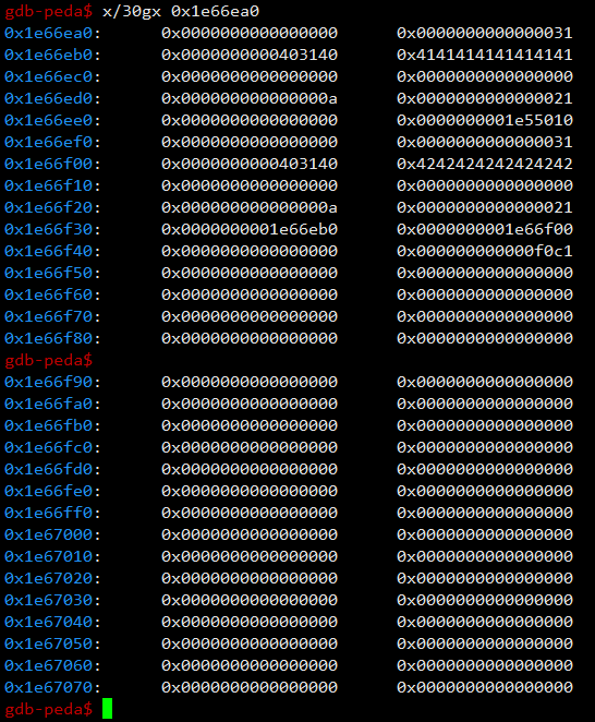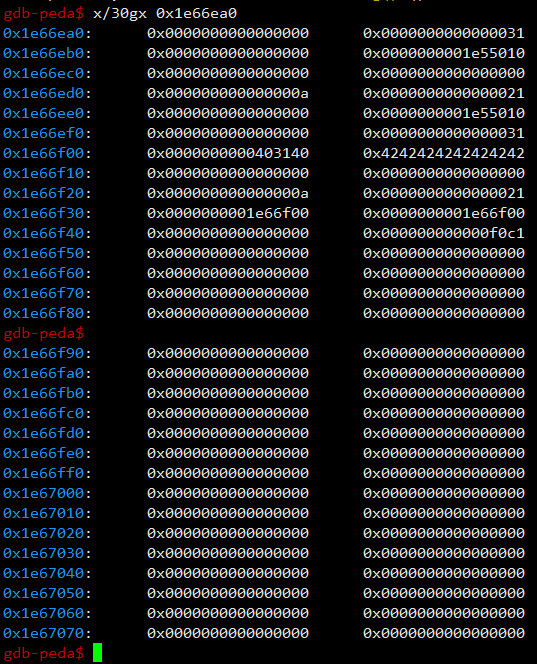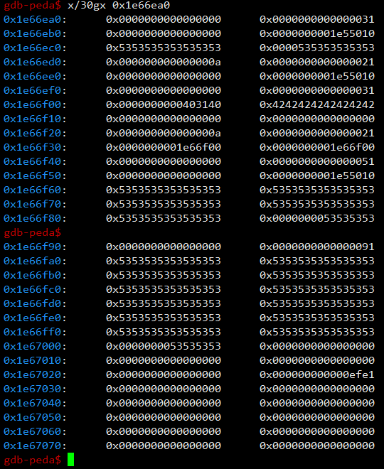 처음에는 adddog( )를 통해서 2개의 객체를 할당했다. 0x1e66eb0, 0x1e66f00에 있는 0x403140은 vtable 주소다. 힙 오버플로우를 통해서 저 값을 덮어씌우거나, 0x1e66f30에 있는 0x1e66eb0 값을 다른 값으로 덮으면 코드의 흐름을 컨트롤 할 수 있을 것이다.