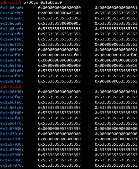사용자로부터 name을 일부러 24 크기를 넘게 입력한 직후의 힙 화면이다. 아직까지는 흐름을 컨트롤 할 수 있는 영역을 못 덮었다.