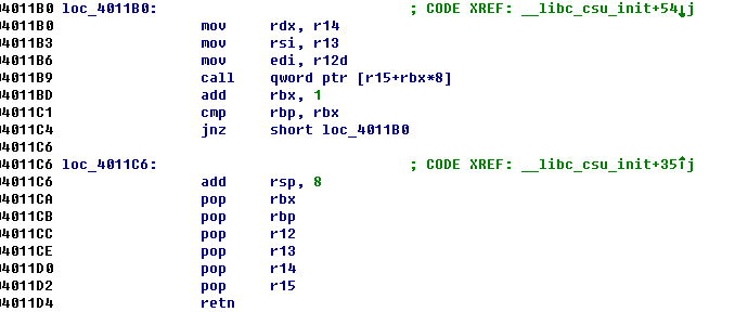 pop rdx는 없지만, pop rbx; pop rbp; ...; pop r15; ret이 있다. 그리고, 0x4011B0에서는, mov rdx, r14 명령을 통해, r14값을 rdx로 옮긴다. rsi, edi 값도 r12, r13 레지스터값을 mov 한다. 다 세팅하고, [r15+rbx*8] 값을 호출한다. 이를 이용해서, rop를 하면 될 것 같다. 공격 시나리오는 다음과 같이 구성했다. (추후에, 해당 방법을 return-to-csu라고 부르는 걸 알았다.)