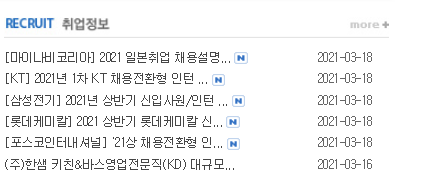 test_data = {'snu_str': ['★ 컴퓨터공학부로 접수되는 채용정보 게시에 대한 안내', 'CJ올리브네트웍스 채용 공고 ', '2021년 제1차 서울문화재단 직원 공개채용', '2021 상반기 ASML Korea 채용', '뉴파워프라즈마 공개채용', '[한온시스템] 2021년 채용연계형 인턴 모집 (~3/22)', '엘리스 코딩 튜터 모집 공고', '[신세계아이앤씨] 2021 상반기 신입사원 모집_공고', '[판이스포] 실리콘벨리 스 타트업 공동창업팀 모집', '[유진투자증권] 대학생 조기채용 전형 안내', '액션파워 연구개발팀 채용 (병역특례 가능)', '2021년 제1차 서울문화재단 직원 공개채용(~03/22)', '[WaveBridge] Quant Developer 채용', '㈜로보티즈 SLAM & Navigation Engineer 외 채용 공고', '㈜데이터뱅크 개발자 채용', '[WorldQuant] 2021년 Quantitative Researcher 상시채용', '2021년도 케이알투자 증권 대졸 신입공채', '[바텍] 의료플랫폼 개발크루 모집(~03/14)', '[라이드플럭스] 자율주행 SW 개발 스타트업 엔지니어 모집', '2021년 상반기 LIG넥스원 신입/경력 공개채용'], 'cau_str': ['\n\t\t\t유디에스㈜ 채용 안내\xa0NEW ', '\n\t\t\t[신청마감 3/18]삼성전자 메모리사업부 폰서트(채용상담 프..\xa0NEW ', '\n\t\t\t[한국정보보호산업협회] 2021년도 서울시 채용연계형 교 육..\xa0NEW ', '\n\t\t\tCJ올리브네트웍스 채용 안내\xa0NEW ', '\n\t\t\t[선데이토즈] 정규직 전환형 서버 인턴십 안내\xa0NEW ', '\n\t\t\t[삼성SDI] 2021년 상반기 신입사원/대학생 인턴 채용 안내\xa0NEW ', '\n\t\t\t[삼성전기] 2021년 상반기 신입사원/인턴 채용 안내\xa0NEW ', '\n\t\t\t(한국정보산업연합회) 21년 하반기 ICT학점연계프로젝트인..\t\t\t\t\t\t\t\t', '\n\t\t\t(주)오너클랜 구인 안내\t\t\t\t\t\t\t\t', '\n\t\t\t[삼성에스원] 2021 상반기 3급 신입사원 채용 안내\t\t\t\t\t\t\t\t'], 'postech_str': ['[한국정보보호산업협회] 2021년도 서울시 채용연계형 ..', '[한국산업은행] 2021년 하반기 신입행원(5급) 채용', '[KIRD] 2021년도 국가R&D 리얼챌린지 프로그램 참여 연..', '[삼성전기] 2021년 상반기 신입사원/인턴 채용 진행 홍..', '[KAI] 신입/경력 채용 온라인 채용상담 안내', '[삼성전자 CE/IM부문] 2021년 상반기 공채/인턴십 직무상..', '[한국SW산업협회]2021 SW스타트업 창업챌린지 공모전', '[삼성SDS] ’21년 상반기 온라인 리크루팅 안내', '병역특례 산업기능요원(현역) 모집', '[현대삼호중공업] 2021년도 상반기 대졸신입 공개채용'], 'ajou_str': ['\n\t\t\t\t\t[DISE] 채용 공고 \n ', '\n\t\t\t\t\t[포 항공과대학교] 정규직 채용 안내\n ', '\n\t\t\t\t\t[삼성] 2021학년도 상반기 삼성 기회균등 특별채용 안내\n ', '\n\t\t\t\t\t[국가정보원] 2021년도 채용연계형 인턴 채용\n ', '\n\t\t\t\t\t[Cisco] 인턴 채용 안내\n ', '\n\t\t\t\t\t[윈스] 2021 공채 모집(~1/21)\n ', '\n\t\t\t\t\t[현대자동차] 경영지원본부 채용전환형 인턴 채용\n ', '\n\t\t\t\t\t쎄믹스 SW개발자 신입사원 채용 안내\n ', '\n\t\t\t\t\t솔트룩스 SW개발자 신입사원 채용 안내\n ', '\n\t\t\t\t\t디아이티 SW개발자 신입사원 채용 안내\n '], 'korea_str': ['[홍보] 한국정보보호산업협회 대학생 기자단 모집', '[홍보] 한국정보보호산업협회 디지털뉴딜 정보보안 실무자 양성 과정 모집', "[채용공고] '법무법인(유한) 태평양' 디지털포렌식 경력직 채용 (~2.17)", '[채용공고] 현대자동차 개인정보보호 관리체계 수립 및 운영 채용전환형 인턴 모집', '[홍보] 2021 소프트웨어 산업 전망 컨퍼런스', '[채용공고] 현대자동차 개인정보보호 관리체계 운영자 모집 홍보', '[홍보] 한국정보보호산업협회 2020년 하반기 정보보호취업박람회 홍보', '[채용공고] SK 인포섹 디지털핵심 실무인재 채용연계 교육생 모집 홍보 (클라우드 정보 보호 분야)', '[채용공고] Alvarez & Marsal 한국지사 인턴 모집 홍보', '[금융보안원] 2021년도 신입직원 채용', "[채용공고] 기아자동차 'ICT 부문' 신입 채용", "[채용공고] 기아자동차 '프라이버시 엔지니어' 신입 채용", '[채용공고] 가천대학교 IT융합대학 AI·소프트웨어학부 교원 초빙(09.25, 13:00까지)', '[채용공고] LG CNS 2020년 하반기 신입사원 채용 홍보', '[채용공고] 2020년 정보통신기획평가원(IITP) 하반기 공개채용 (~10.6(화))', '[홍보] 한국정보보호산업협회 정보보호산업 맞춤형 인재 양성 과정 홍보', '[채용공고] 성신여자대학교 융합보안공학과 교수채용', '[채용공고] 세메스 보안전문가 체용 공고', '[채용공고] 한국사회보장정보원 직원 채용공고', '[채용공고] 김.장 법률사무소 직원채용 안내', '[채용공고] 도로교통공단 2020년도 NCS기 반 신규직원 공개채용 공고', '[홍보] 한국정보보호산업협회 정보보호산업 맞춤형 인재 양성 과정 안내', '[채용공고] 포스코인 터내셔널 2020년 채용전환형 실무수습사원 모집', '[채용공고] 한국화학연구원 2020년 하반기 인턴 및 2차 박사후연구원 선발 공고', '[채용공고] 한국교육학술정보원 2020년 상반기 정규직 직원 채용 안내', '[채용공고] 2020년 KB증권 채용연계형 인턴 공채 안내', '[채용공고] (주)시큐레터 신입/경력 직원 채용 공고', '[채용공고] 안진회계법인 위험관리본부 정보보호 전문가 모집 안내', '[홍보] SK인포섹 "2020년 4차 산업혁명 선도인력 양성사업" 교육생 모집', '[채용공고] 2020년도 (사)한국음악저작권협 회 신입직원 및 연구용역 계약직 공개 채용']