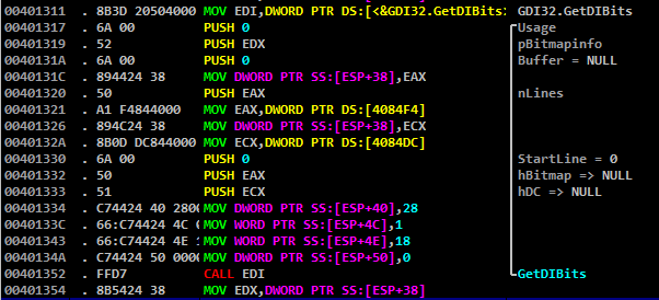 계속 분석해보면 GetDIBits 함수를 호출한다. 검색해보니 지정된 호환 비트맵에서 비트열을 뽑아내서 지정된 포맷을 사용하는 DIB로 버퍼에 복사한다고 한다. 아마 그린 이미지를 비트맵으로 읽어서 비트열을 뽑아내서 메모리 어딘가에 저장하는 것 같다.