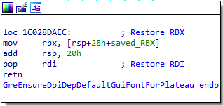 loc_1C028DAEC를 살펴보면, RAX을 수정하고 영향을 끼치는 코드는 없는 것을 확인할 수 있다. 이는 여전히 RAX에는 win32kbase!gahDpiDepDefaultGuiFonts 포인터가 저장되어 있고, GreEnsureDpiDepDefaultGuiFontForPleateau의 리턴값이 NtGdiEnsureDpiDepDefaultGuiFontForPlateau의 리턴값으로 반환되어 공격자의 사용자 코드로 반환될 수 있다는 것이다.