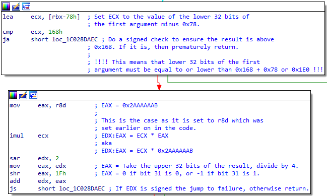 다음 코드는 공격자가 NtGdiEnsureDpiDepDefaultGuiFontForPlateau 함수의 인자로 전달한 값이 0x1E0보다 작거나 같은지 확인한다. 그리고 인자값에 0x2AAAAAAB를 곱하고 4로 나누는 이전과 동일한 작업을 수행한다. 결과를 확인하여 signed 숫자인지 아닌지 검사한다. signed가 아니라면 실행을 계속한다.
