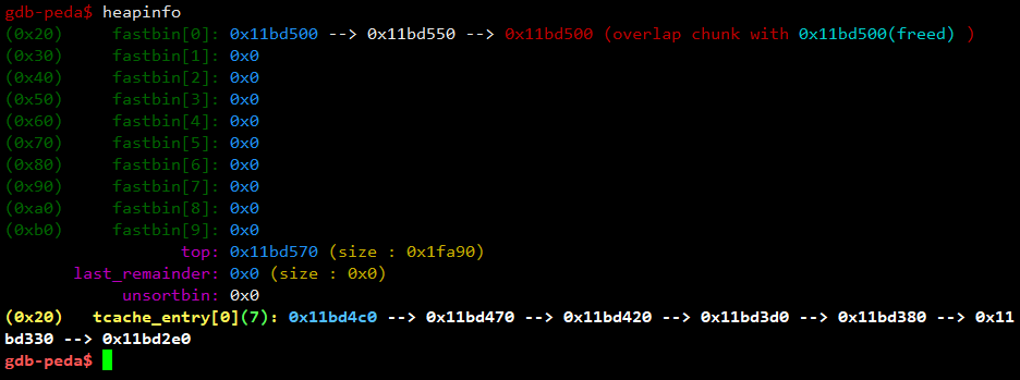 위의 예제처럼 7개를 free하고 추가로 0x11bd500과 0x11bd550 두 개의 포인터를 double free한 모습이다. 이 상태에서 다시 같은 크기(0x10)로 메모리 할당을 요청하면 아래 그림과 같이 된다.