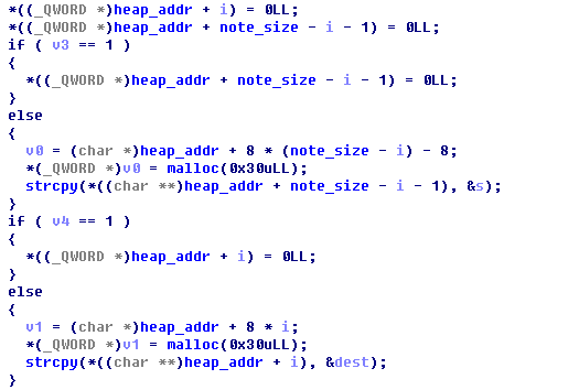 그 다음에는 각 가리킨 값을 0으로 초기화한다. 만약 위에서 v3가 1로 설정되었다면 그 반대되는 주소인 *(heap_addr + note_size - i - 1)에 0을 넣는다. 아니라면, 반대되는 주소에 새롭게 0x30만큼 동적할당하고, &s에 저장했던 값을 strcpy( ) 함수를 통해 복사한다.