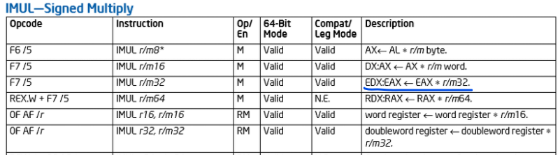 - ECX를 EDX로 설정하며 위의 곱셈 결과의 상위 32비트를 4로 나눈 값으로 overwrite한다.