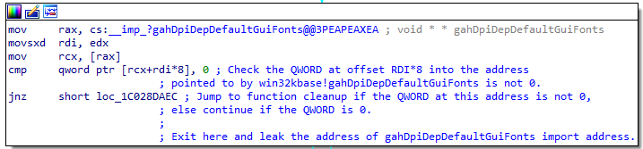 위의 모든 코드실행이 끝나고, win32kbase!gahDpiDepDefaultGuiFonts 포인터는 RAX에 저장된다. RAX는 역참조되어 RCX에 저장된다. 공격자가 NtGdiEnsureDpiDepDefaultGuiFontForPlateau 함수의 인자로 넘긴 값을 0x2AAAAAAB 곱하고 4로 나눈 값이 저장된 RDI는 RCX의 Buffer index로 사용된다. 만약, 해당 index의 QWORD 값이 0이 아니라면 loc_1C028DAEC로 점프한다.