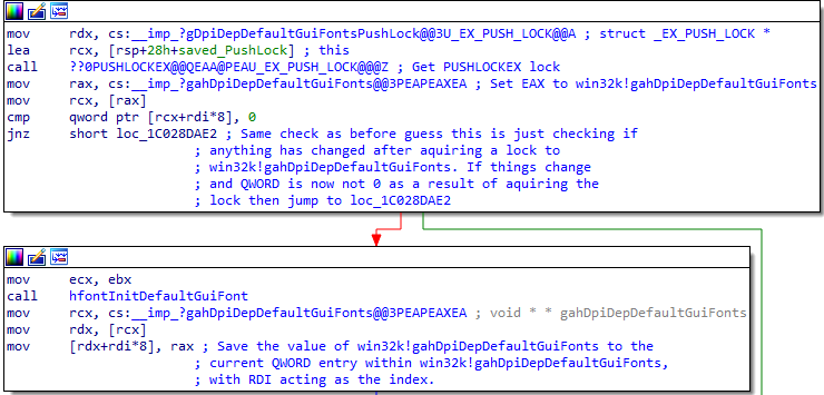 첫 번째 블록에서는 qword ptr [rcx+rdi*8] 값이 여전히 0인지 검사하기 전에, win32kbase!gahDpiDepDefaultGuiFonts 값을 가져온다. 만약, 0이라면 [RDX+RDI*8]이 win32kbase!gahDpiDepDefaultGuiFonts으로 설정된다. [RCX+RDI*8] 검사하기 이전에 [RDX+RDI*8]이 설정되기 때문에 0이 아니게 되므로 검사를 성공적으로 통과할 수 있다.