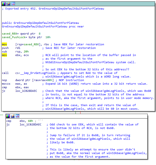 다음 구문에서는 공격자가 인자로 넘긴 NtGdiEnsureDpiDepDefaultGuiFontForPlateau의 하위 32비트 값이 60인지 검사한다. 만약 60이라면, GreEnsureDpiDepDefaultGuiFontForPlateau는 종료되고, NtGdiEnsureDpiDepDefaultGuiFontForPlateau으로 다시 실행된다. 60이 아니라면, 코드는 계속 실행된다. 아래 이미지를 통해 설명한 2개의 검사를 확인할 수 있다.