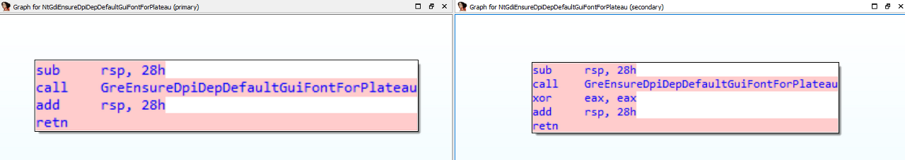 이 그래프를 통해 Microsoft는 NtGdiEnsureDpiDepDefaultGuiFontForPlateau 함수는 늘 0x0을 리턴하게 패치된 것을 확인할 수 있다. Github에서 해당 함수의 Prototype을 확인할 수 있다.