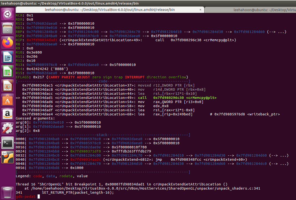 - 0xdeadbeef uiId를 통해 다음 uiId를 0xcafebeef로 덮어쓰고, pData를 cr_unpackDispatch+216 (crServerDispatchBoundsInfoCr 함수 주소 테이블)로 덮는다.