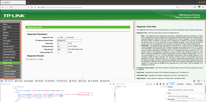 ping 기능에서 에러를 찾는다. IP 주소에 문자열 aaaaaaaaa...aaa를 입력해봤지만 50글자 이상 입력할 수 없었고 ping 에러 메시지가 출력되었다. ping 요청을 전송할 때, /userRpm/PingIframeRpm.htm으로 요청한다.